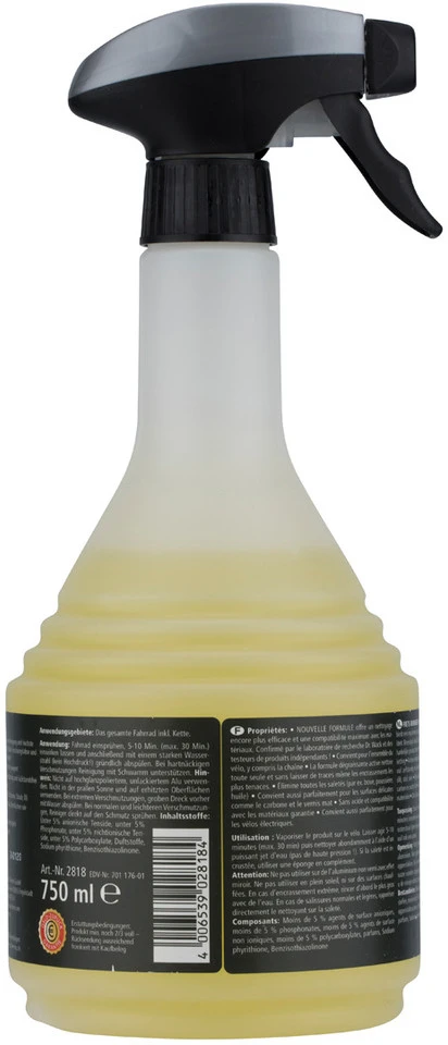Especificaciones:Denominación:Limpiador de bicicletas F100Campo de aplicación:Limpiar bicicletasCaracterísticas:adecuado para toda la bicicleta, incluyendo la cadenaelimina incluso la suciedad más resistente gracias a su fórmula activa de disolución de la grasalimpia de forma independiente y sin dejar residuosprotege las superficies sensibles (por ejemplo, aluminio, cromo, carbono, piezas anodizadas)también adecuado para la laca matelibre de ácido y compatible con el materialadecuado para de bicicletas eléctricasUso:rociar la bicicleta completamentedejar actuar entre 5-10 minutos (30 minutos en caso de fuerte suciedad)a continuación, enjuagar bien con chorro de agua (¡sin alta presión!) hasta que la formación de espuma ya no sea visibleapoyar la limpieza con esponja o cepillo si es necesario