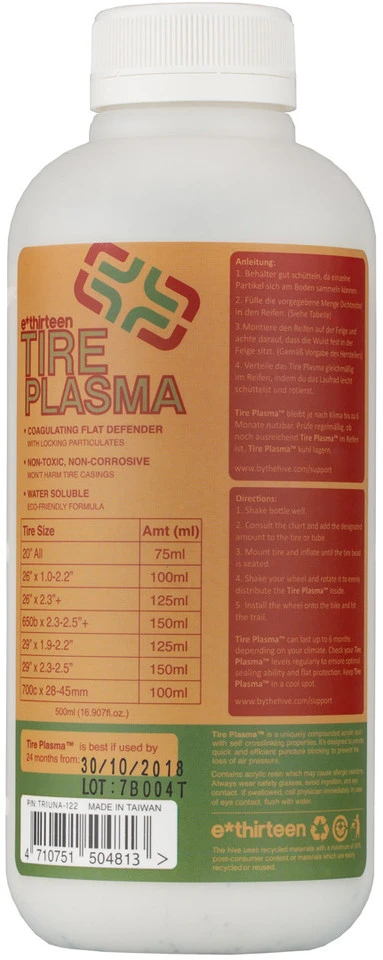 El sellador de llantas Tire Plasma de e*thirteen tiene una composición única con placas de resina acrílica que se entrecruzan por si mismas. Está diseñado para sellar rápida y eficientemente grietas y agujeros con un tamaño de hasta cuatro milímetros. Una pérdida de presión en tu cubierta se mantiene lo más baja posible y puedes continuar directamente. Debido a la composición especial, ni los flancos de tus cubiertas ni el medio ambiente se ven afectados. En determinadas circunstancias, las propiedades de auto-crosculación del sellador pueden causar un aumento de la floculación de la leche de sellado, por lo que e*thirteen recomienda llenar el sellador directamente en la cubierta. El Tire Plasma está libre de amoniaco.