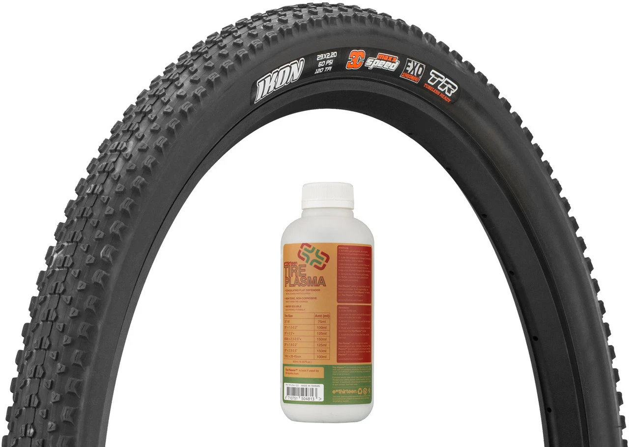 La cubierta plegable Maxxis Ikon 3C MaxxSpeed EXO TR 29″ en un set con el sellador de cubiertas e*thirteen Tire Plasma