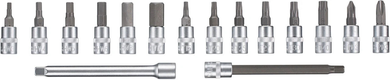 1 x Llave de torsión de 3min19sec6 x Accesorio hexagonal1 x Accesorio hexagonal extralargo6 x Accesorio Torx2 x Accesorio de estrella2 x Llave tubular1 x alargador1 x Caja de almacenamiento